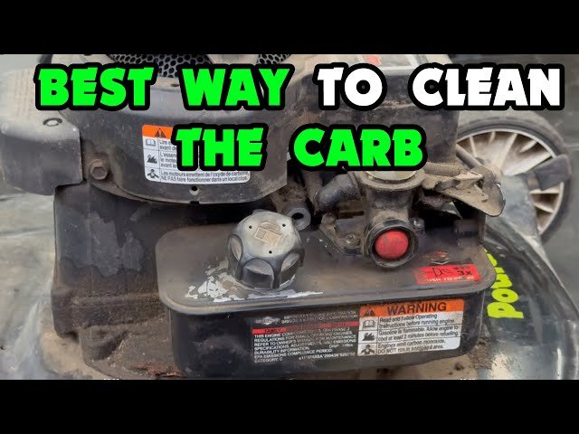 Start by removing the carburetor from your mower, then soak it in a bowl filled with a carburetor cleaning solution or a mix of warm water and mild detergent. Let it soak for at least 30 minutes to loosen the gunk inside.
