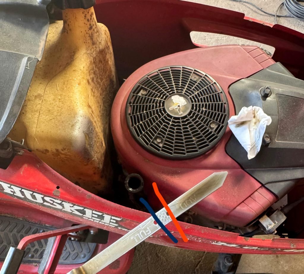 Checking the oil level often is one of the easiest ways to prevent damage. You don’t need special tools—just a clean rag and the dipstick that comes with your mower. Pull out the dipstick, wipe it clean, then reinsert and pull it out again to see the oil level.