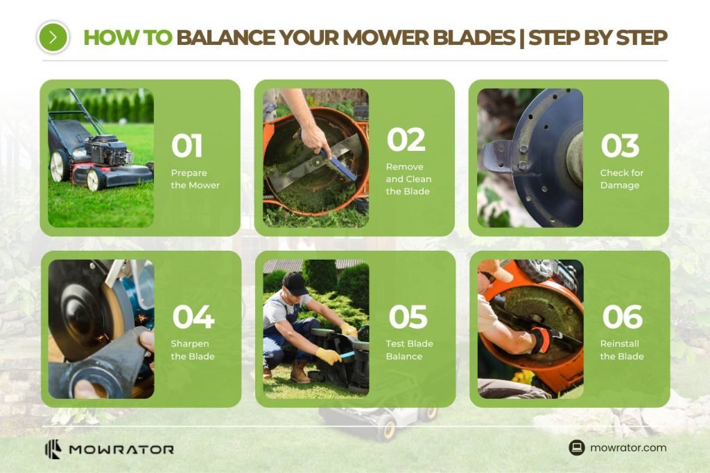 Use a metal file or a sharpening tool to sharpen the blades. Follow the original angle of the blade edge. Sharpen evenly on both sides for a balanced cut. After sharpening, check blade balance using a blade balancer or hang it on a nail. Adjust by removing small amounts of metal until balanced. Balanced blades reduce vibration and ensure smooth mowing.