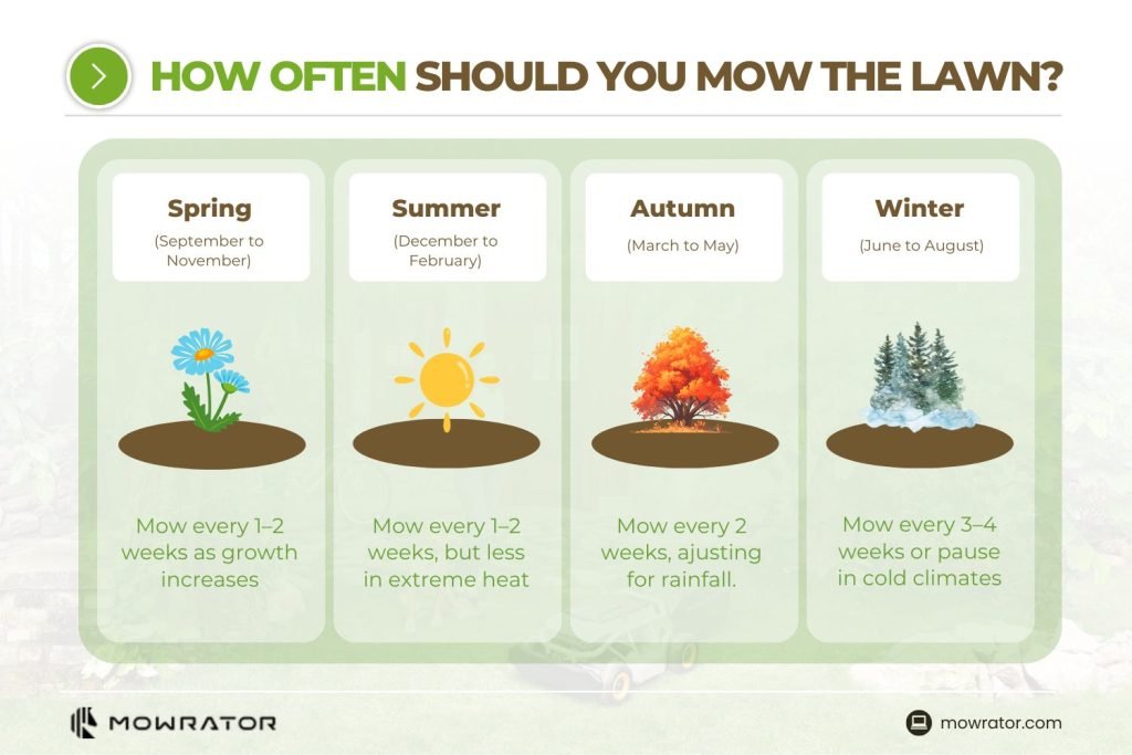 Seasonal changes affect the ideal cutting height. During hot summer months, raise the mower blade to about 2 inchesto protect roots from heat. In cooler seasons, a shorter cut is fine to encourage growth.